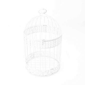 Features: 17" White Birdcage Clasp allows to style open or closed Approximate overall height:17.5" Approximate width 10" White gloss paint on metal Also available in gold Set of 2 or 13" White Birdcage available! Ideal for baby showers, quinceaneras' and weddings!