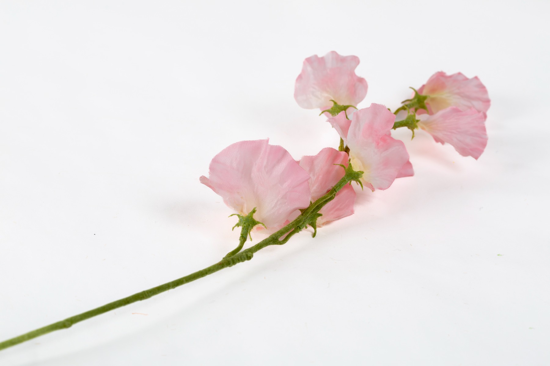 Introducing the 22" Pink Faux Sweet Pea Spray a delicate floral gem. With 7 flowers accentuating soft, flowy charm, each bloom showcases a gentle pink hue with a cream-colored center. The stem, featuring a built-in wire, offers bendability for versatile arrangements. Adding to its realism, the stem has a "peach fuzz" texture, enhancing both the look and feel.