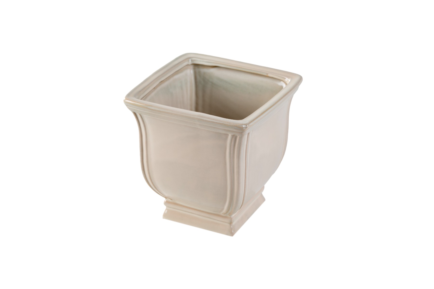 Features: Cream glazed ceramic Classic square urn Approximate height: 6 1/2" Approximate width:6 1/8" Approximate base dimensions: 3 5/8th x 3 5/8th" Approximate inner dimensions: 4 1/4th x 6 1/4"