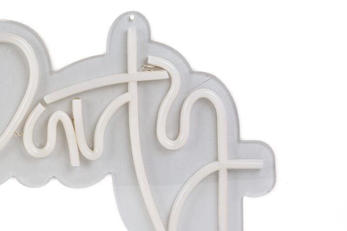 Features: L.E.D. "Neon" light sign White light " Let's Party" ideal for all occasions AC/DC Adapter included or operable with 8AA batteries (Not Included) Approximate dimensions: 10" at its tallest point & at its widest point 22 1/2" Simple and easy to set up! Pair with our Boxwood wall panel!