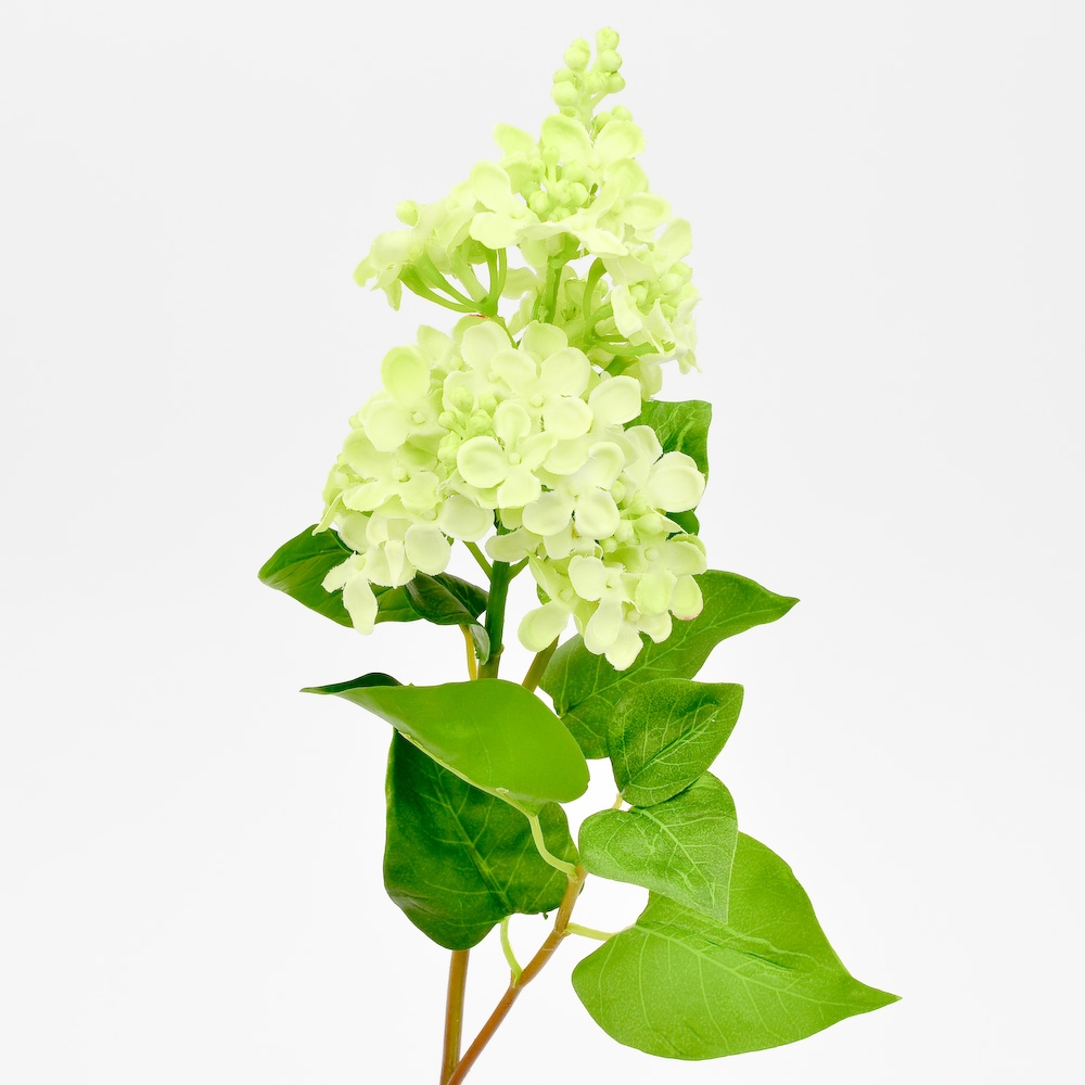 Each stem measures 22.5 inches long and features one open light green lilac surrounded by dark green leaves for a realistic touch. The stem is made from metal and wrapped in plastic, making it easy to bend and shape.